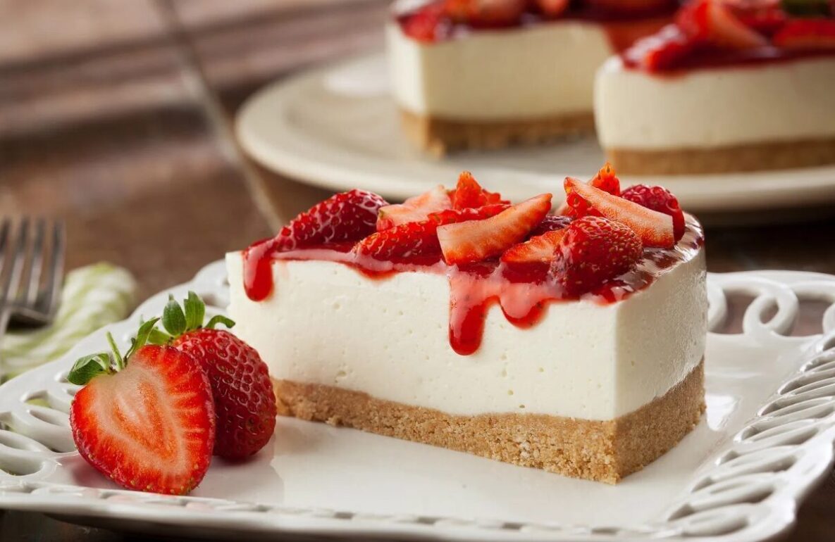Uma camada cremosa de cheesecake encontra uma cobertura doce de morangos frescos, criando uma sobremesa irresistível e sofisticada.